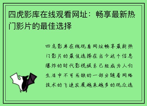 四虎影库在线观看网址:畅享最新热门影片的最佳选择 在当今这个信息爆炸的时代,影视娱乐已经成为人们生活中不可或缺的一部分。随着网络技术的飞速发展,越来越多的观众选择通过在线平台观看电影和电视剧。而在...