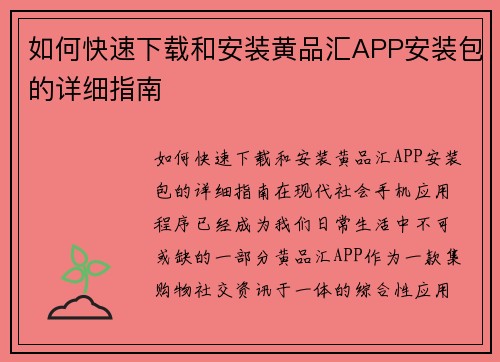 如何快速下载和安装黄品汇APP安装包的详细指南 在现代社会,手机应用程序已经成为我们日常生活中不可或缺的一部分。黄品汇APP作为一款集购物、社交、资讯于一体的综合性应用,受到了越来越多用户的青睐。...