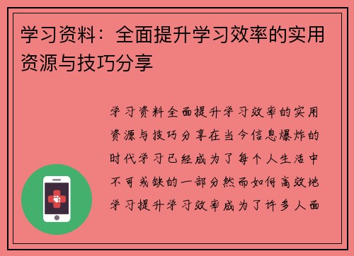 学习资料:全面提升学习效率的实用资源与技巧分享 在当今信息爆炸的时代,学习已经成为了每个人生活中不可或缺的一部分。然而,如何高效地学习,提升学习效率,成为了许多人面临的挑战。本文将分享一些实用的学...